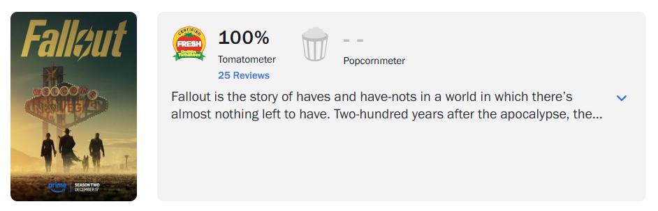 A segunda temporada de Fallout, do Prime Video, estreou com 100% de aprovação da crítica no Rotten Tomatoes.