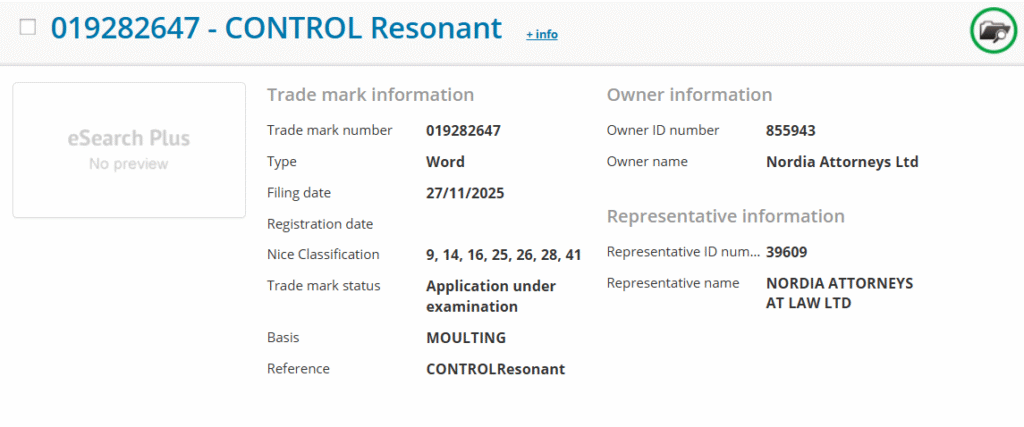 Primeiramente identificado pelo MP1st, a marca Control Resonant foi registrada no Escritório de Propriedade Intelectual da União Europeia.