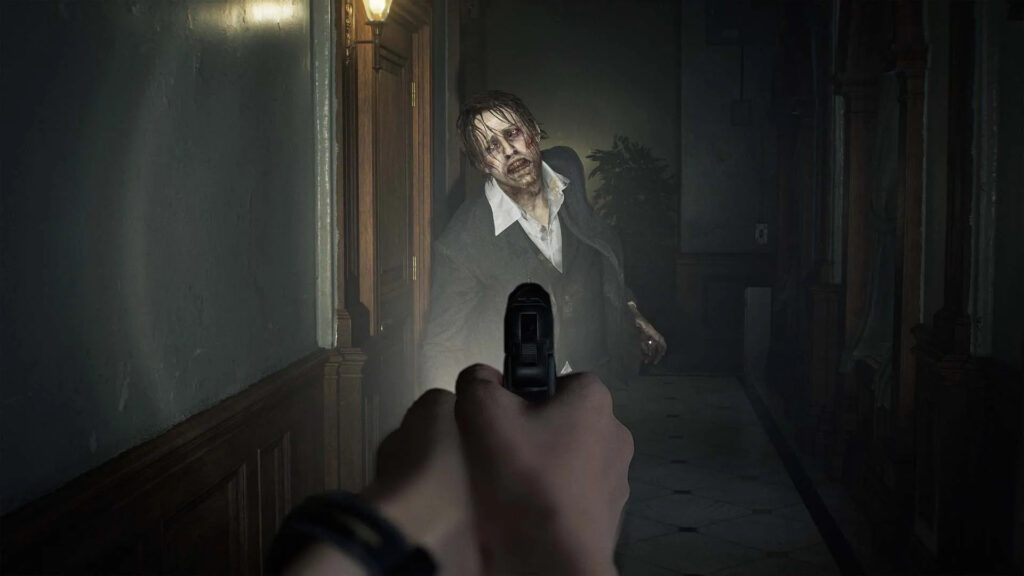 A primeira metade do jogo em Rhodes Hill é uma aula de direção de arte, com corredores apertados, pouca iluminação e muito terror. Lembra um pouco a sensação de explorar a R.P.D em RE2, com aquele ar que causa mistério e medo.