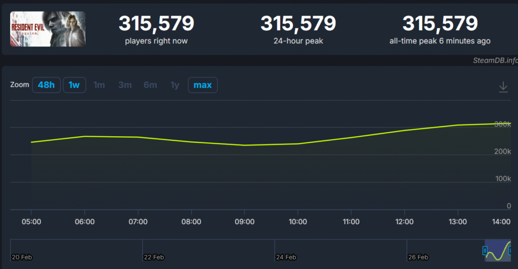 Na atualização mais recente do site, o jogo chegou a um novo pico de 315 mil jogadores simultâneos. RE Requiem é, até agora, o maior lançamento de 2026 na Steam.