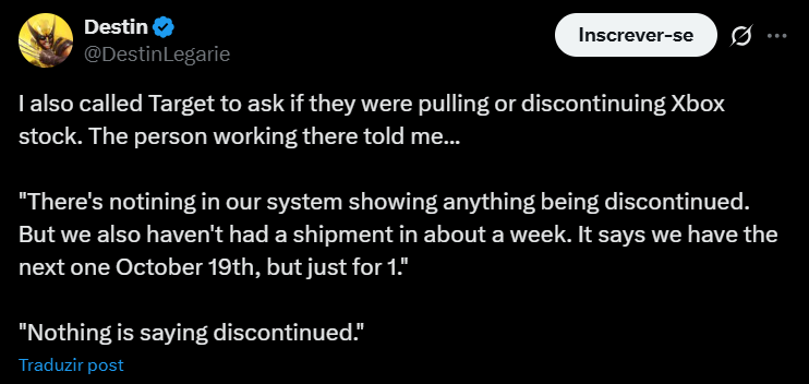 Também liguei para a Target para perguntar se eles estavam retirando ou descontinuando o estoque do Xbox. A pessoa que trabalha lá me disse…